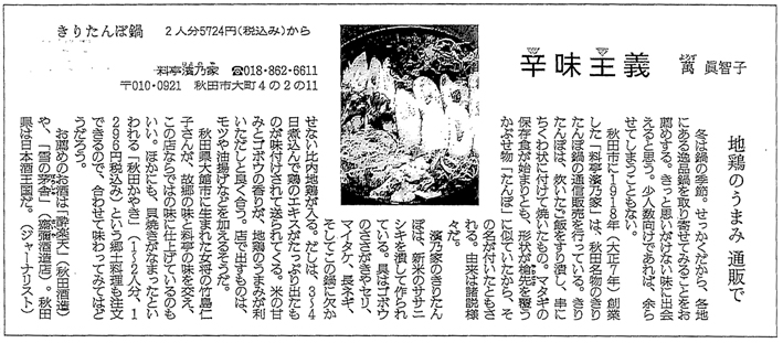 | 昭和56年9月 | 秋田空港開設と同年に全国にきりたんぽ地方発送を開始 |